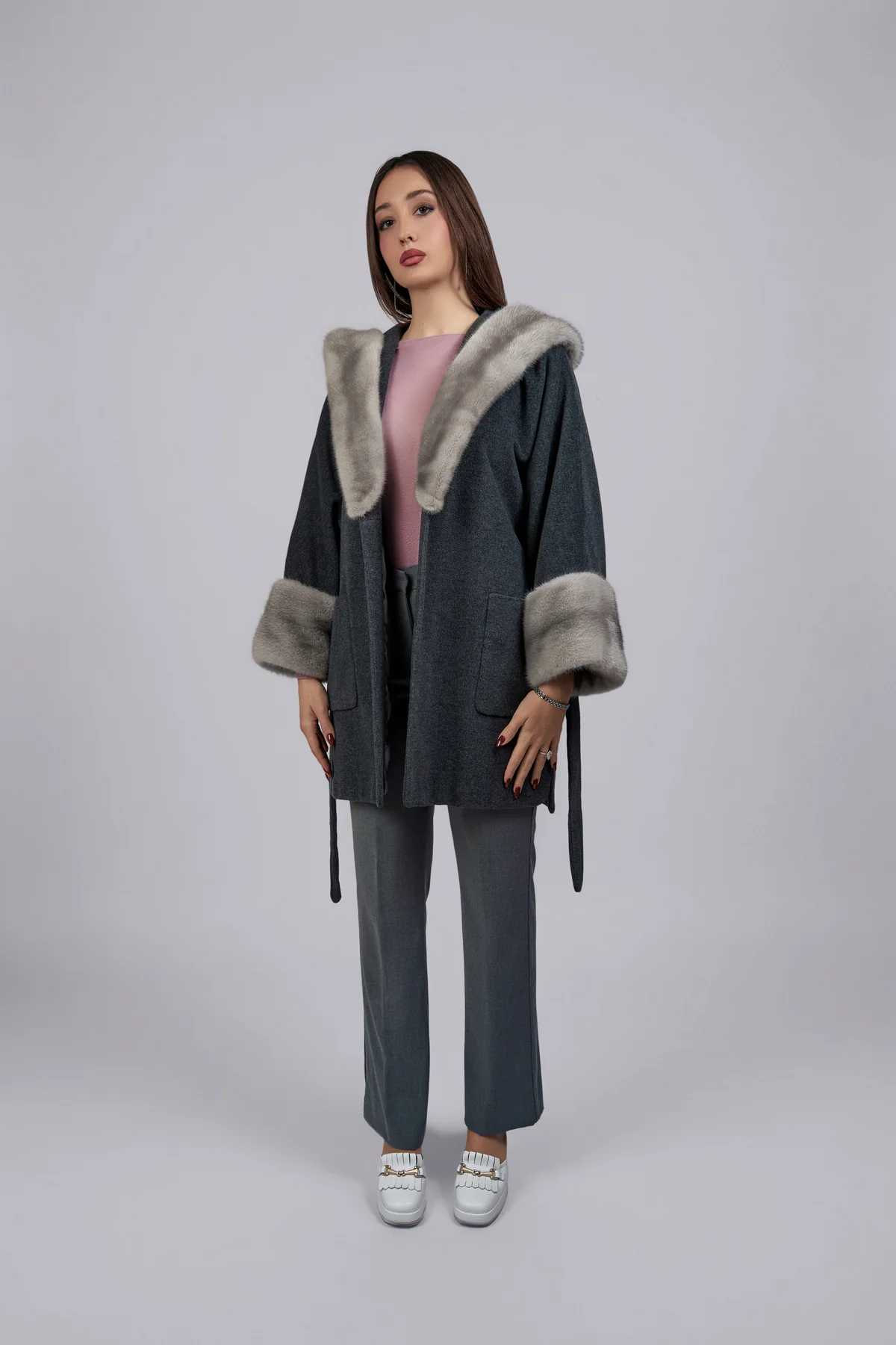 Cappotto grigio scuro in lana vergine e cashmere con dettagli in pelo di visone argento.